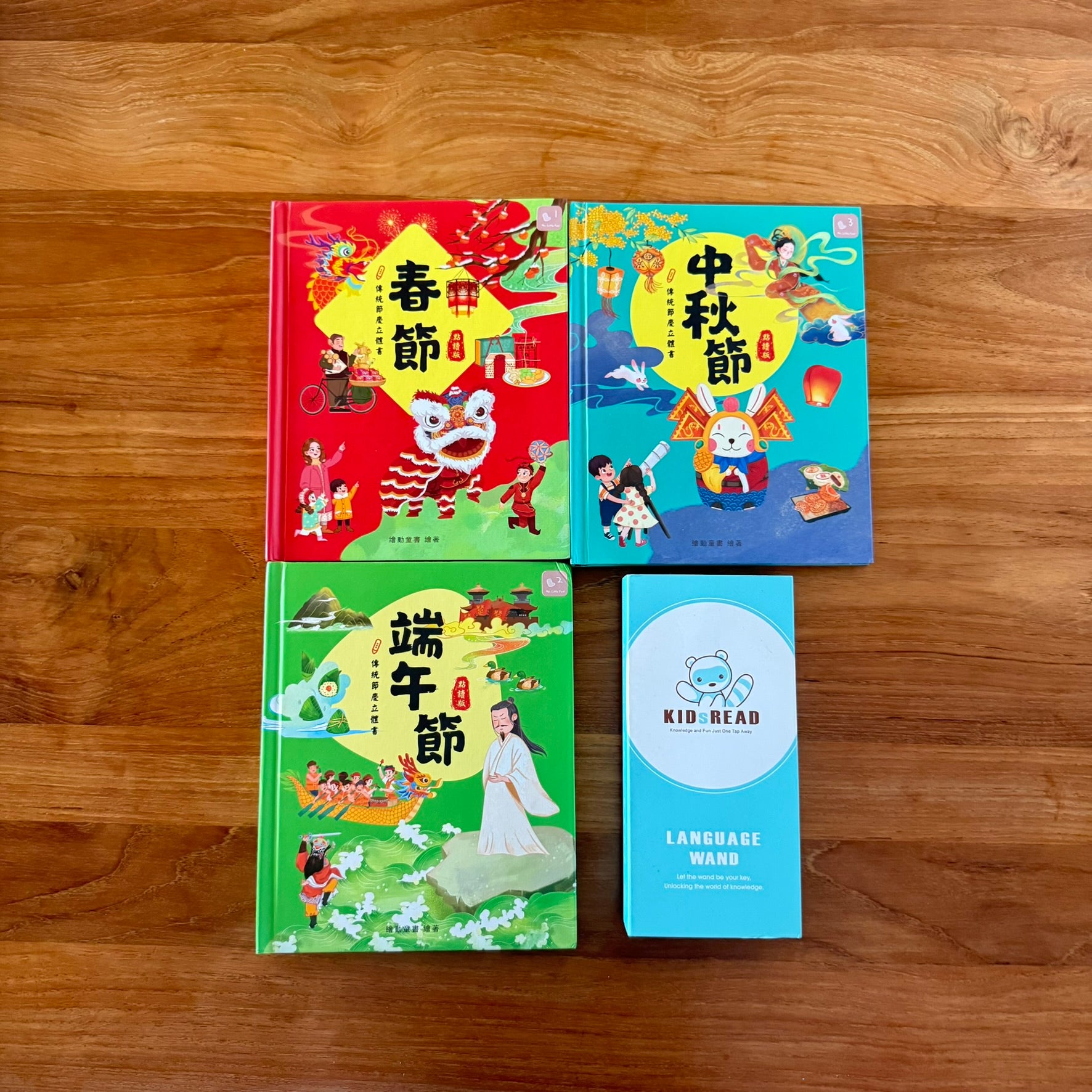 書籍一套三本(春節、 端午節、中秋節),語音點讀除官方台灣國語版外還包含了小腳先生獨家製作廣東話點讀版 ,相等得到六本的音檔內容。