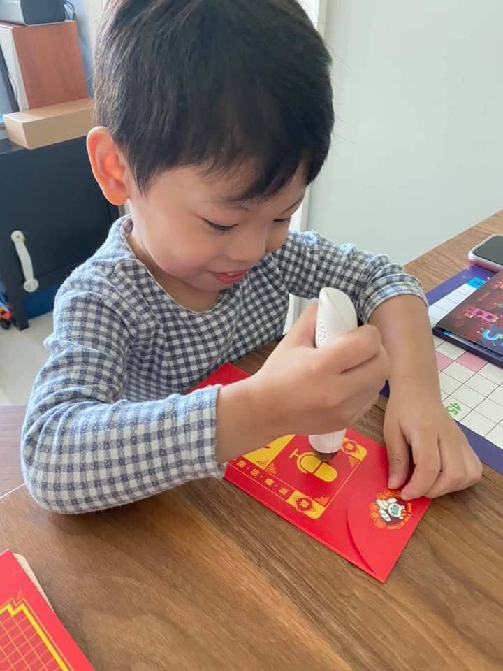 • 正面聆聽指示,A款:寫出童心祝福語,B款:金色貼紙拼貼祝福,C款:金色貼紙拼貼新氣象