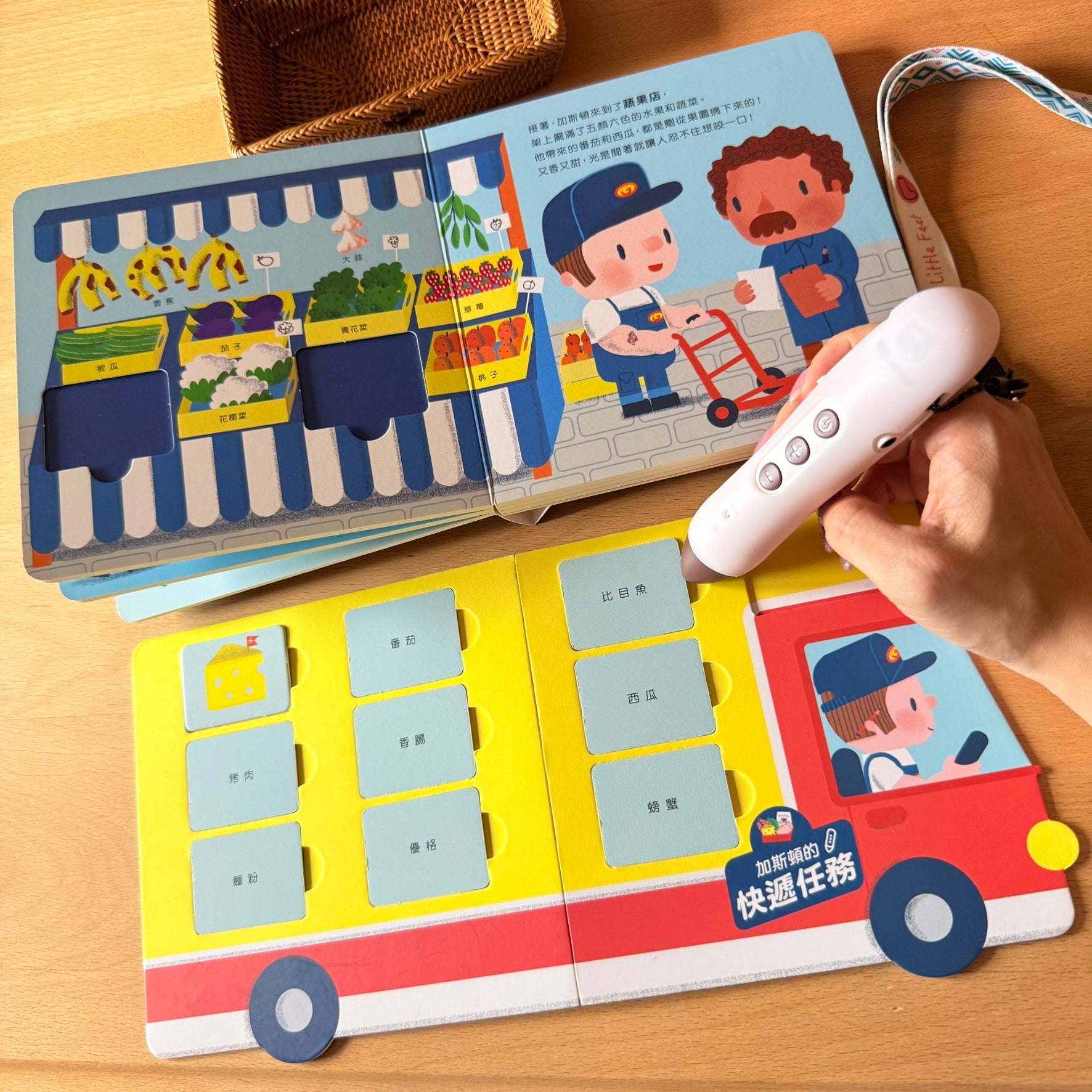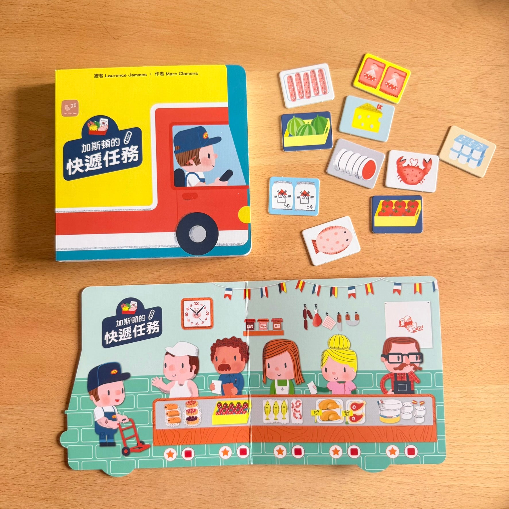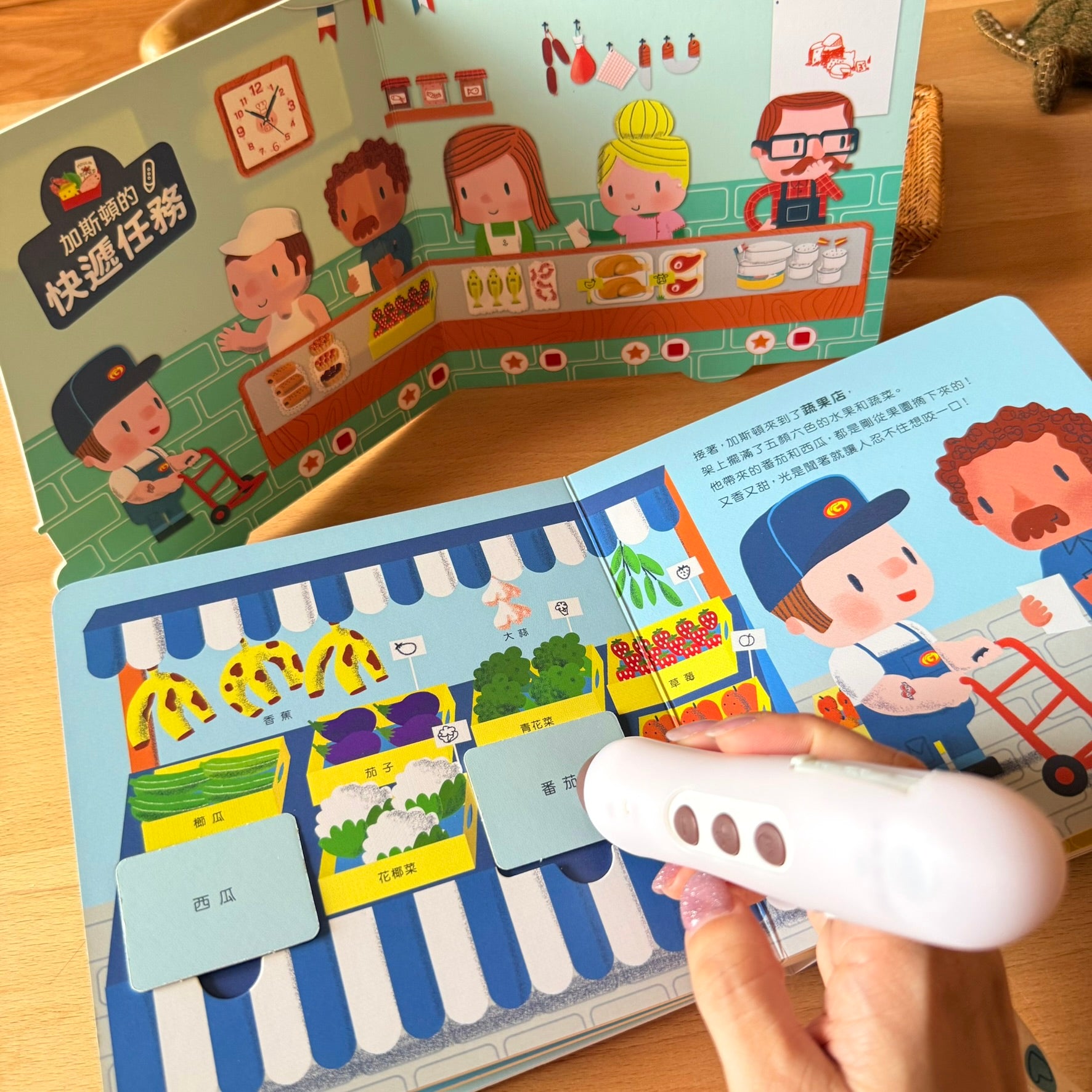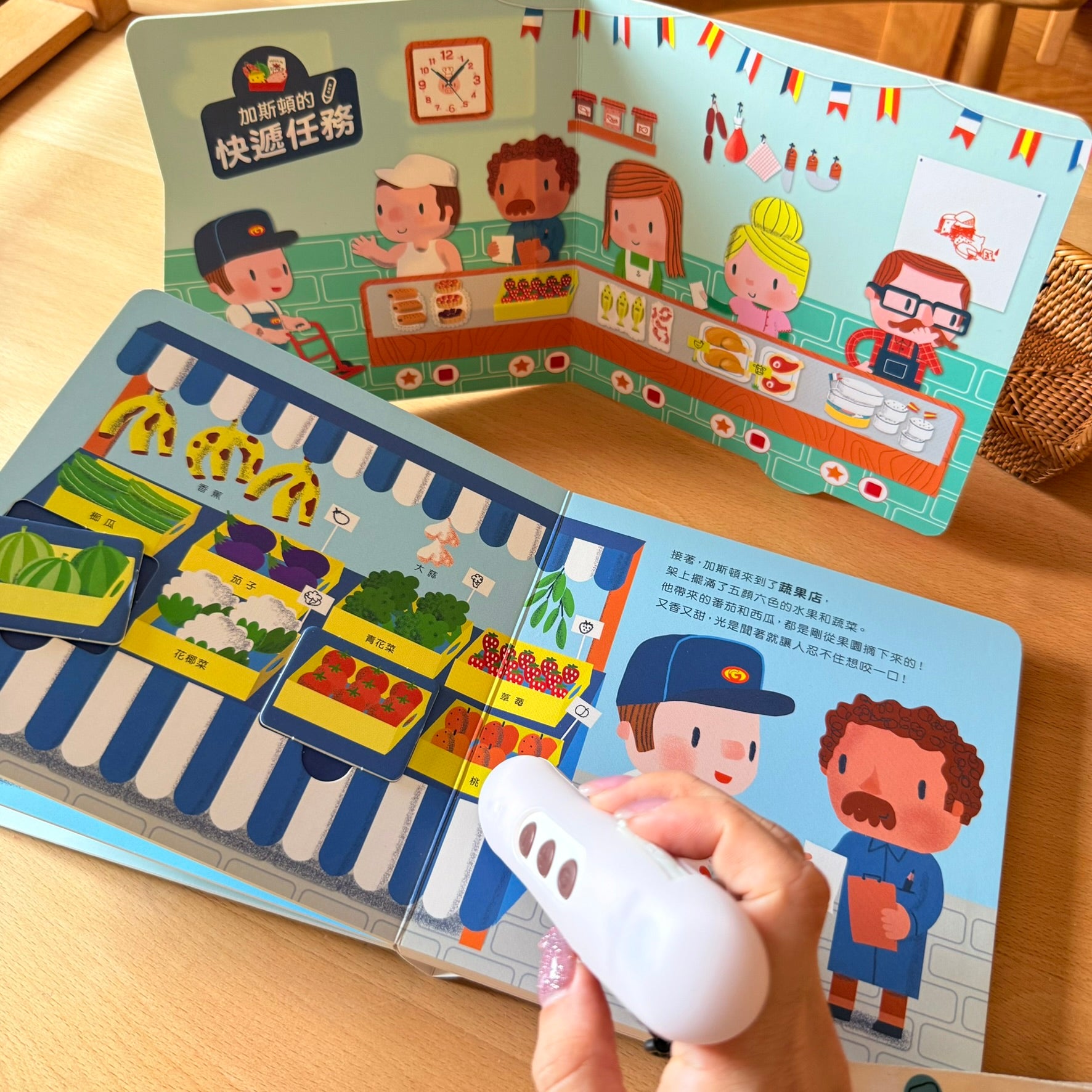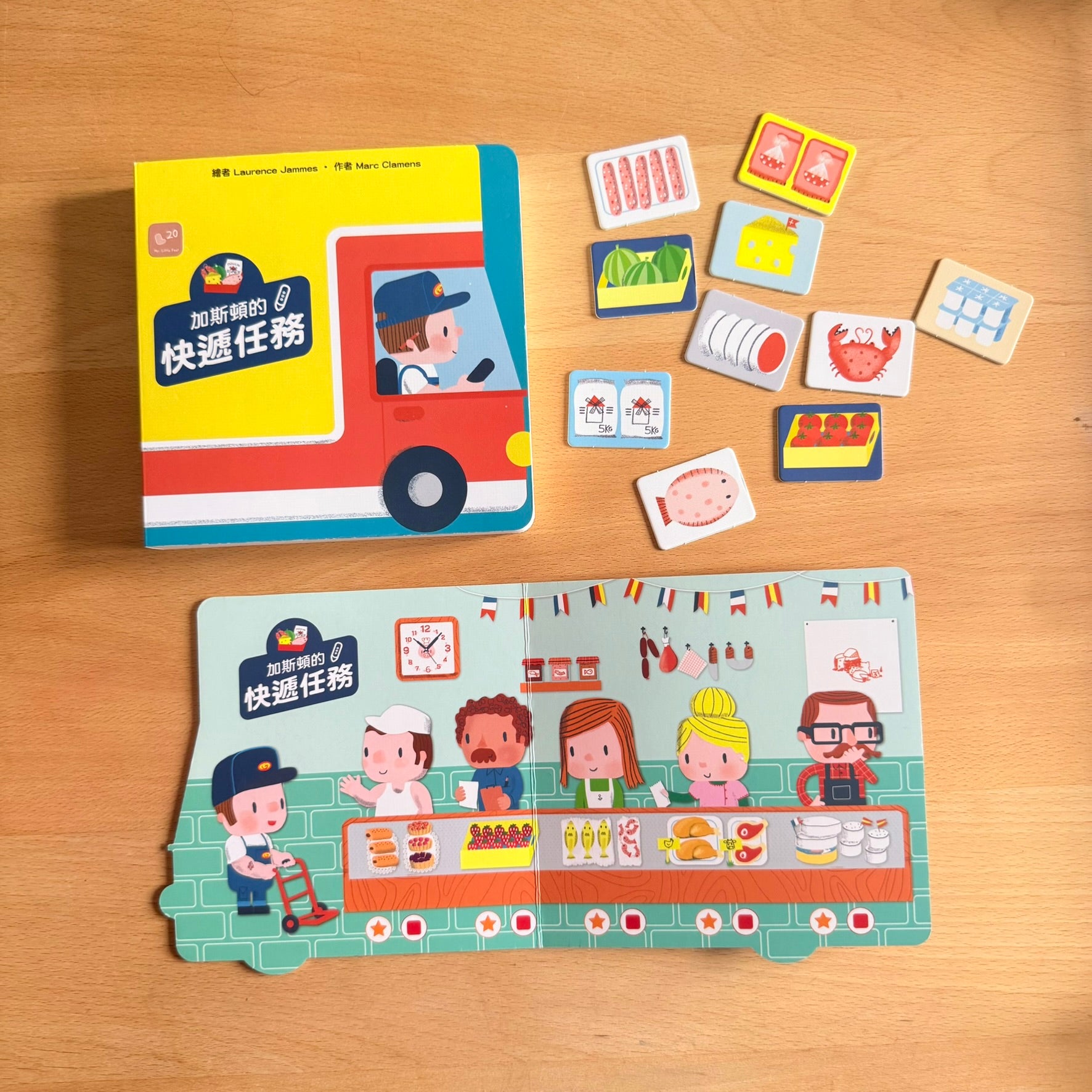 《加斯頓的快遞任務》是一套結合 食材認知、任務挑戰與職業體驗 的互動式遊戲書。