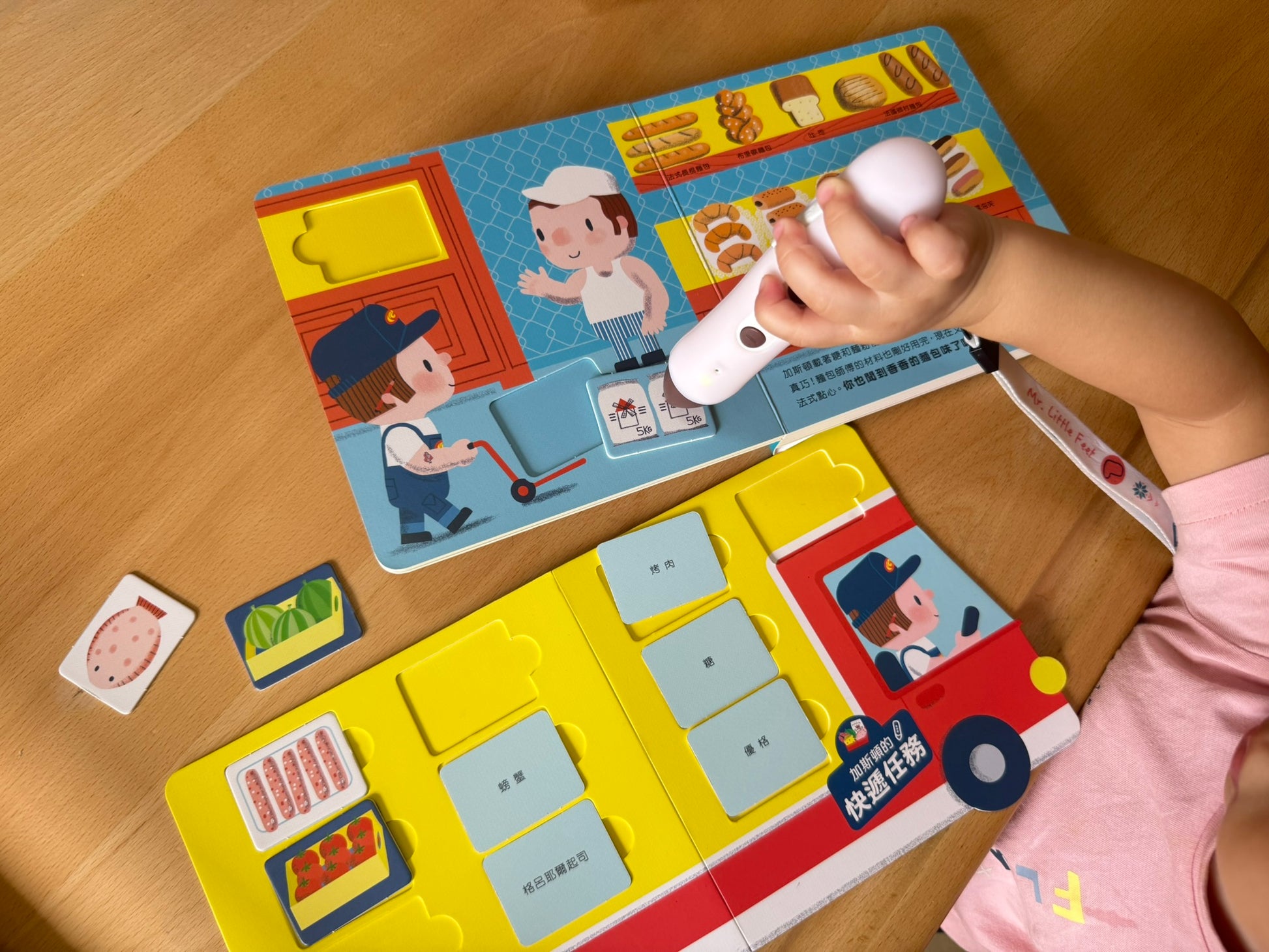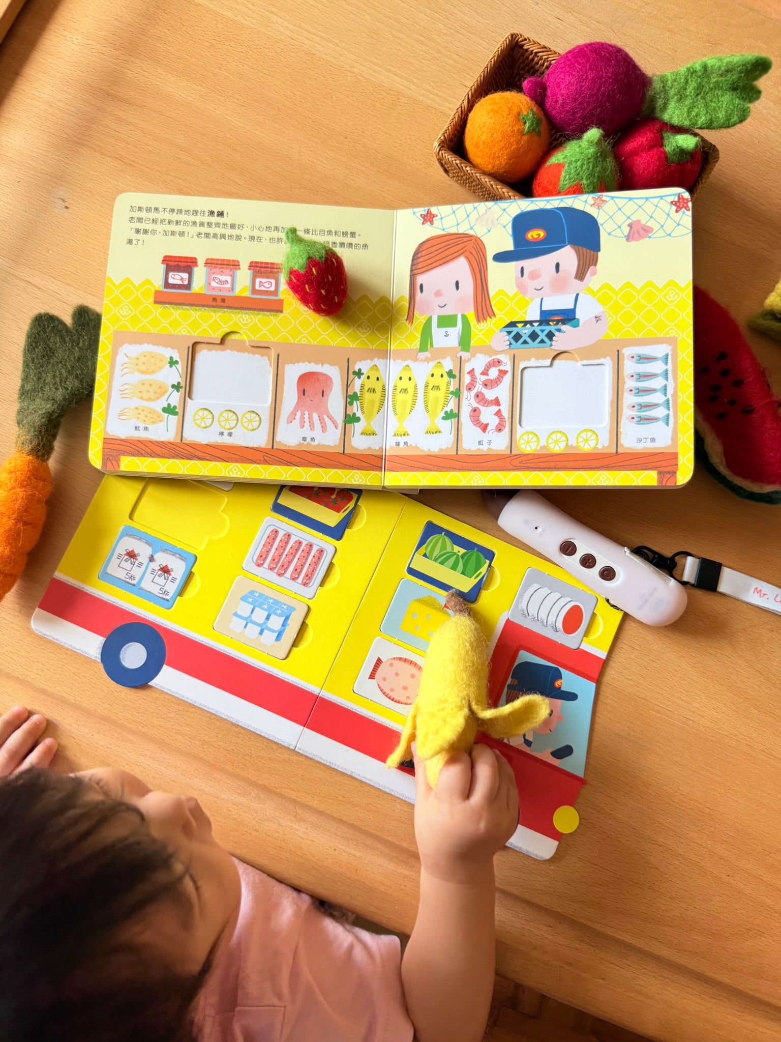 書中收錄麵包店、水果攤、魚鋪等經典商店,在這本書裡,孩子不只是翻頁看圖,而是要動手操作、找一找、搬一搬、對照清單,親身體驗送貨與店舖助手的工作樂趣。