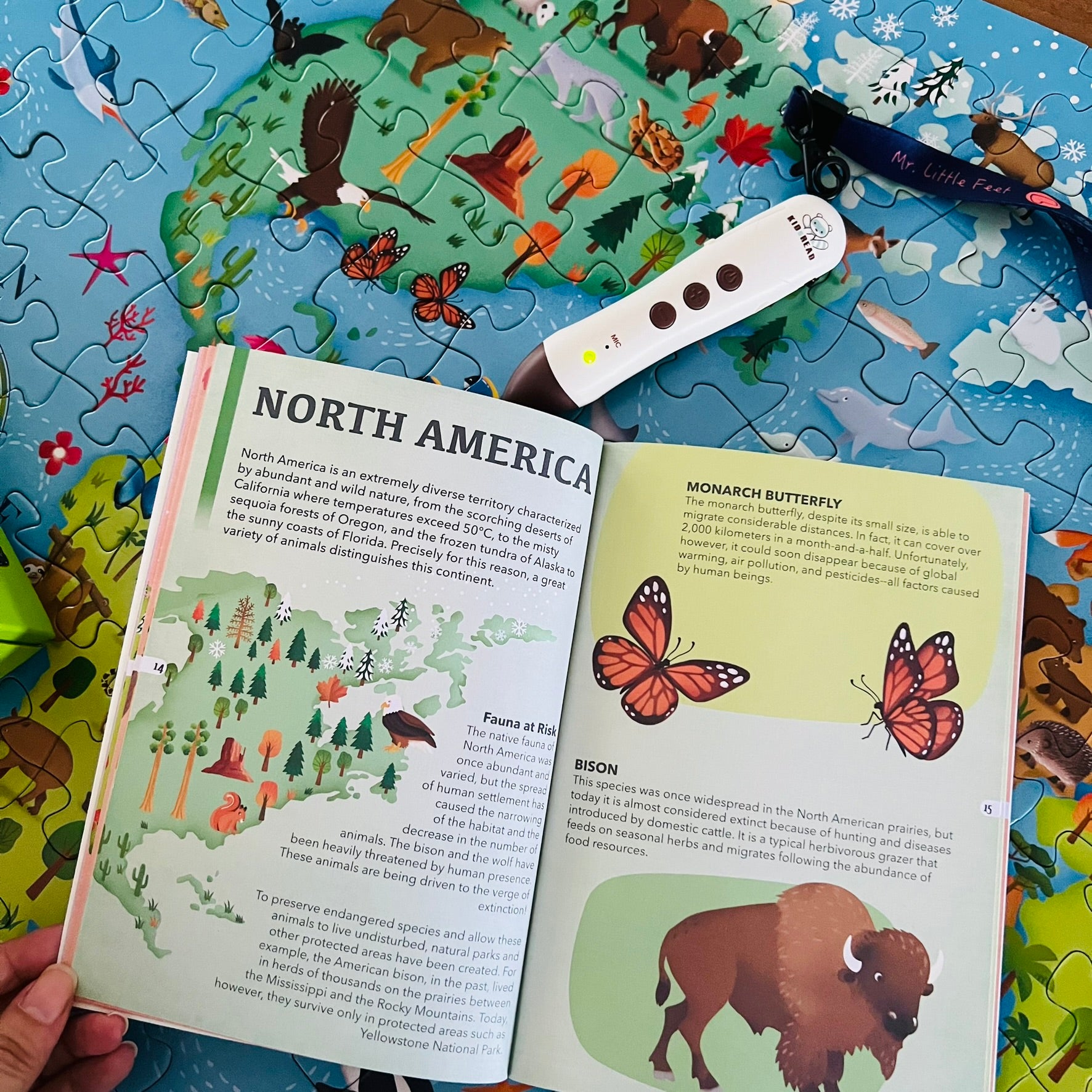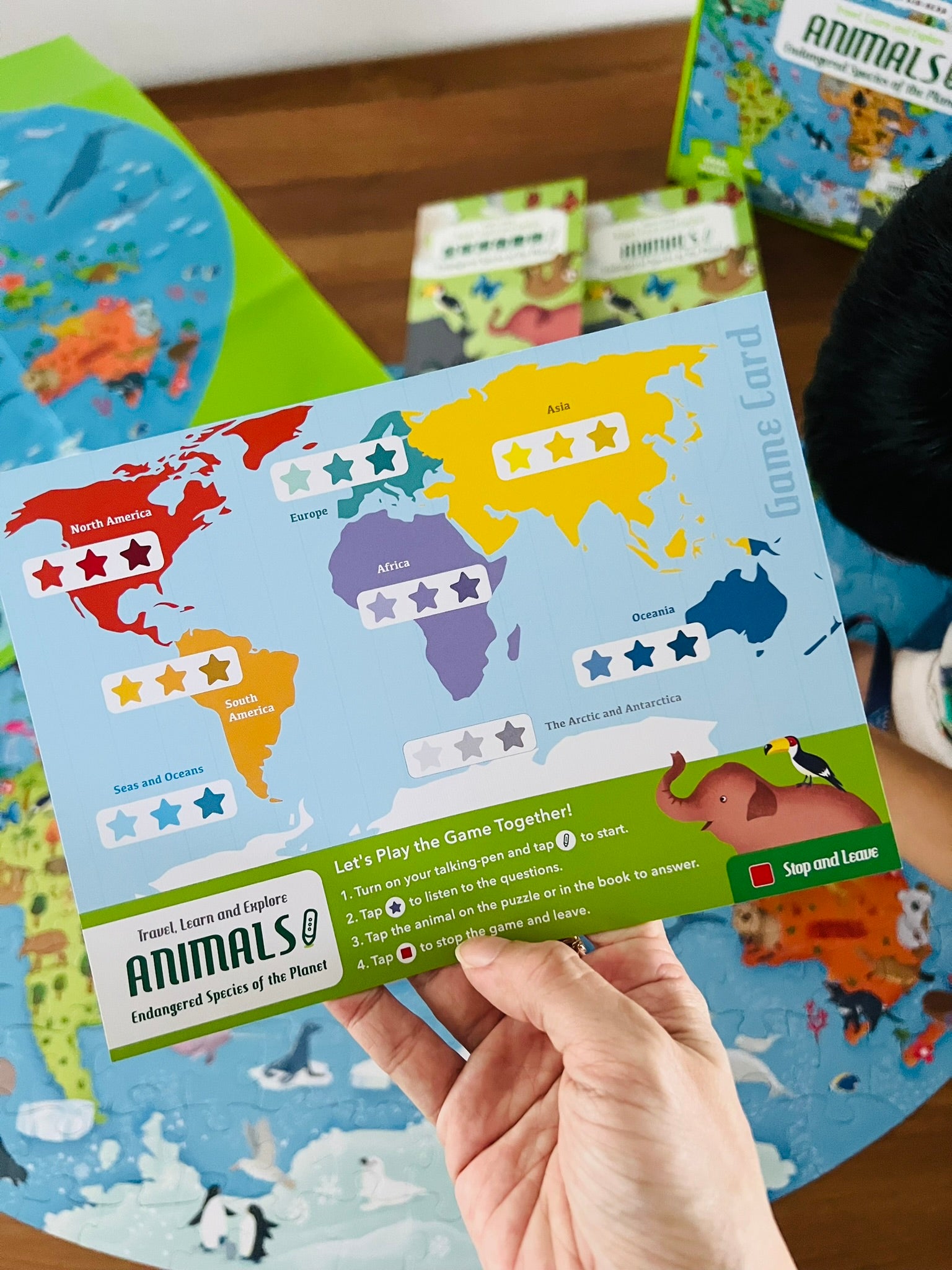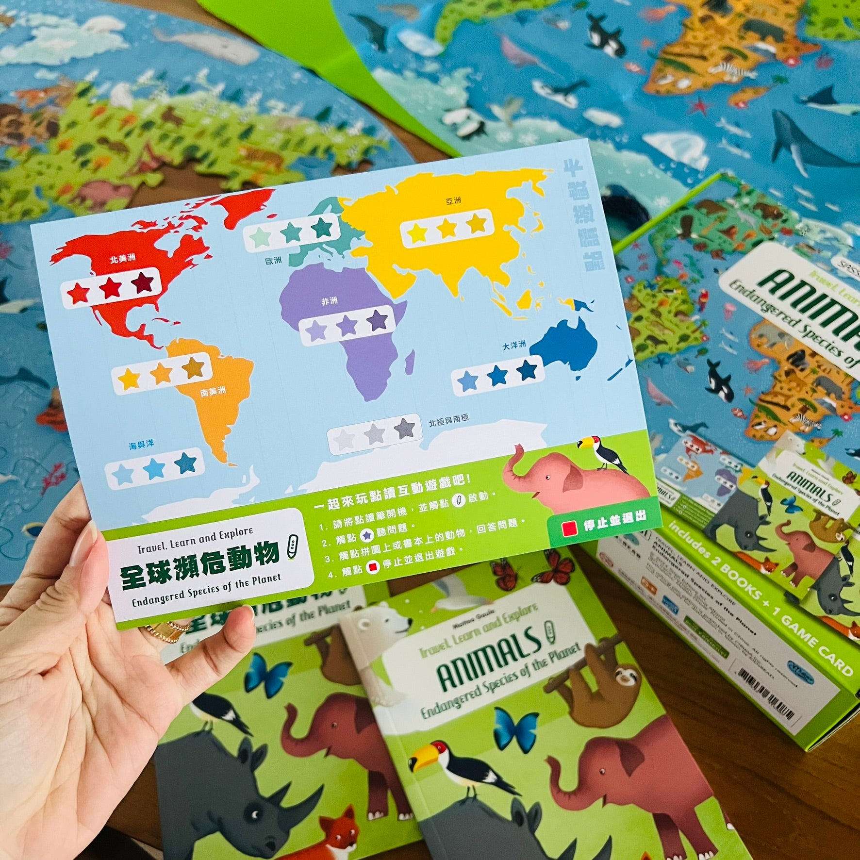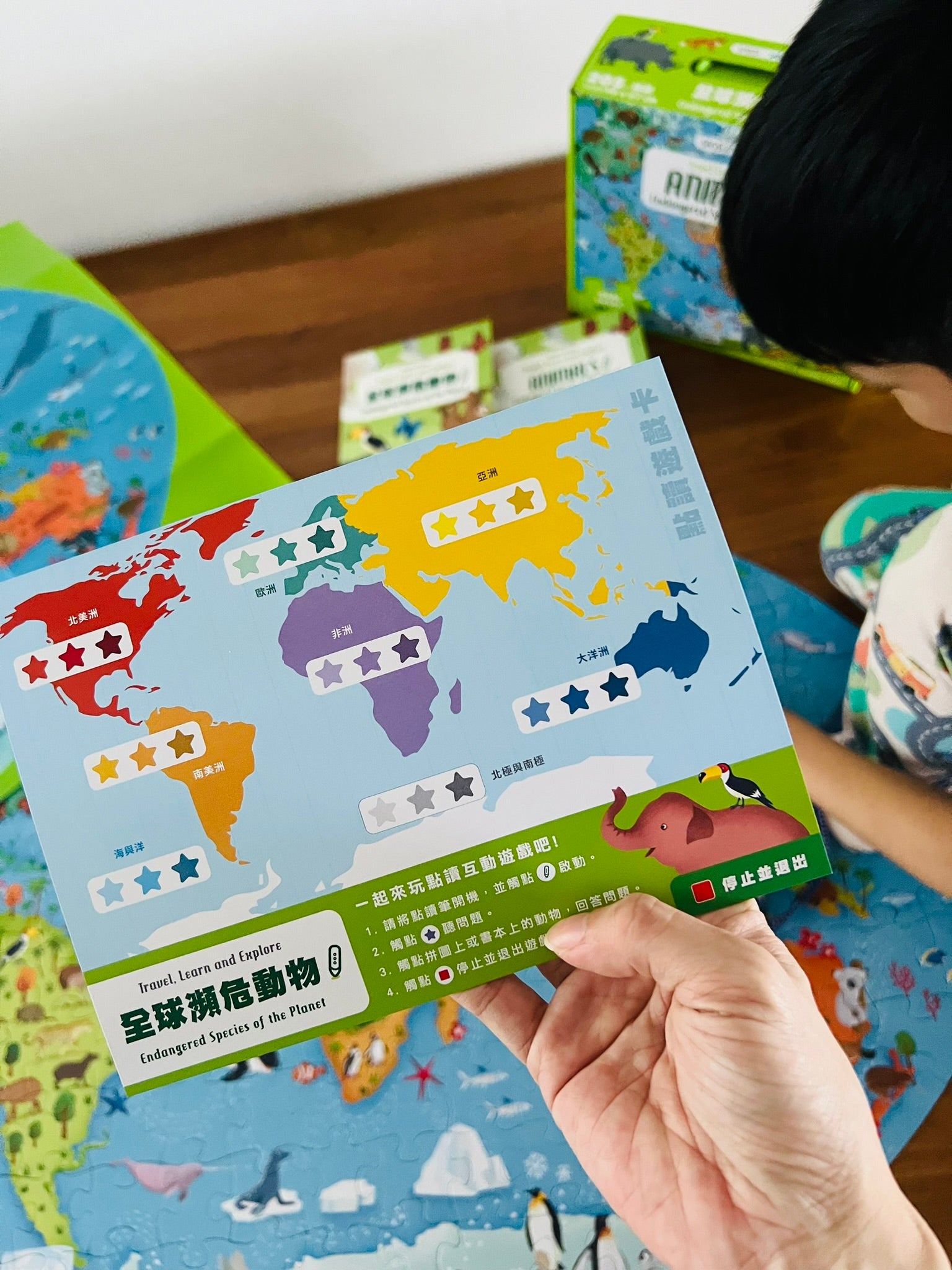 地圖包含了七大洲四大洋的中英點讀, 加上有不同的瀕危絕種動物,所有在拼圖上的動物也是可雙語點讀的。玩過讀過之後,可以跟小孩玩玩互動遊戲卡的遊戲。每個洲有分別三個不同難度、不同中英語句式問答的互動點讀遊戲。考考孩子可以理解多少。