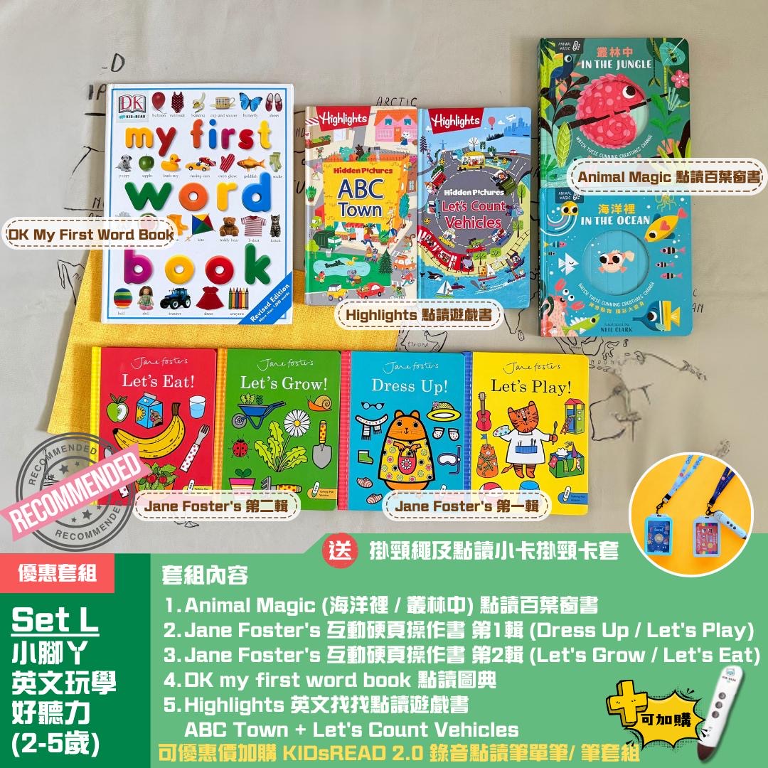 這個套組集合了五年來,香港團購媽媽們 一致好評的英文玩學聽力教材! 這五項教材都是經典知名的出版社製作,並與KIDsREAD點讀筆創意打造好玩的英文聽力教材。 好掃你所有的點讀遊戲絕對能幫孩子玩中學玩中洗耳朵培養英文好聽力!