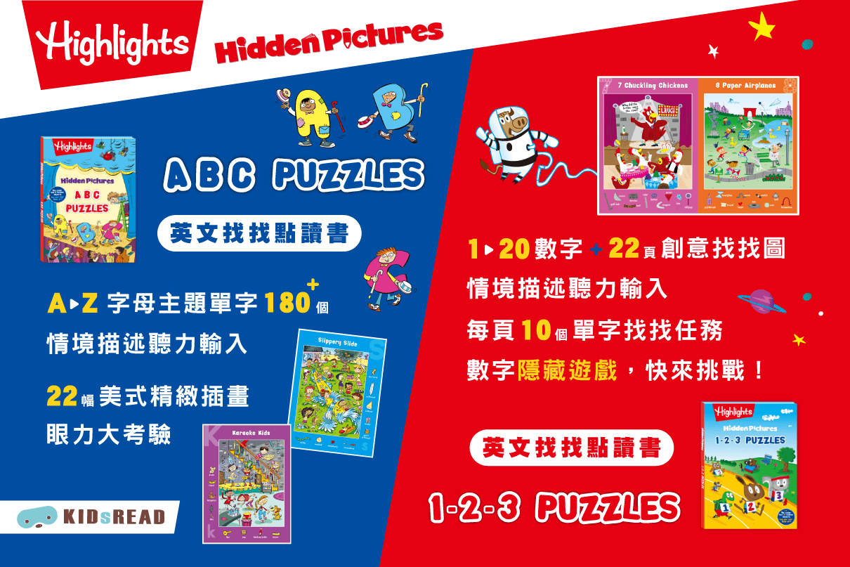 《Highlights 英文找找點讀書遊戲書 ABC Town + Let's Count Vehicles》更是該系列中極受歡迎的作品!尤其是這套書的材質耐玩,絕對是外出用餐或旅行孩子們必備的點讀教材好夥伴!汽車主題包含各種交通工具上天下海孩子們除了考英文聆聽更加需要細心觀察才能正確回答遊戲問題!很多媽媽們都反映孩子們玩得不亦樂乎,超有用好玩的別入手點讀教材!
