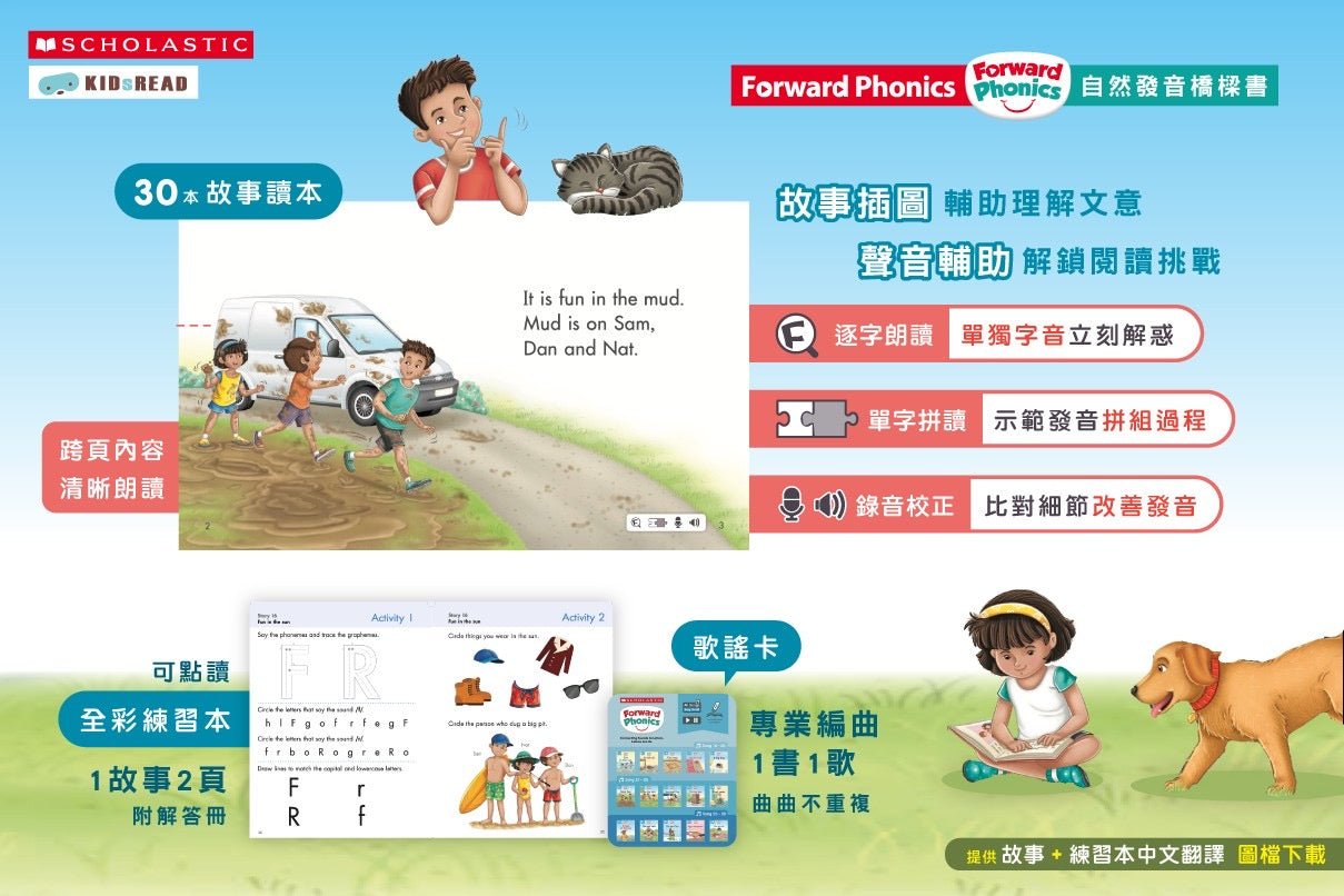Scholastic Forward Phonics 是一套有系統的拼音教材, 打好基本功,培養孩子能自信地自行閱讀。明確的學習目標讓孩子將聲音連結英文字母,再利用生活化的情節讓孩子連繫到日常生活。