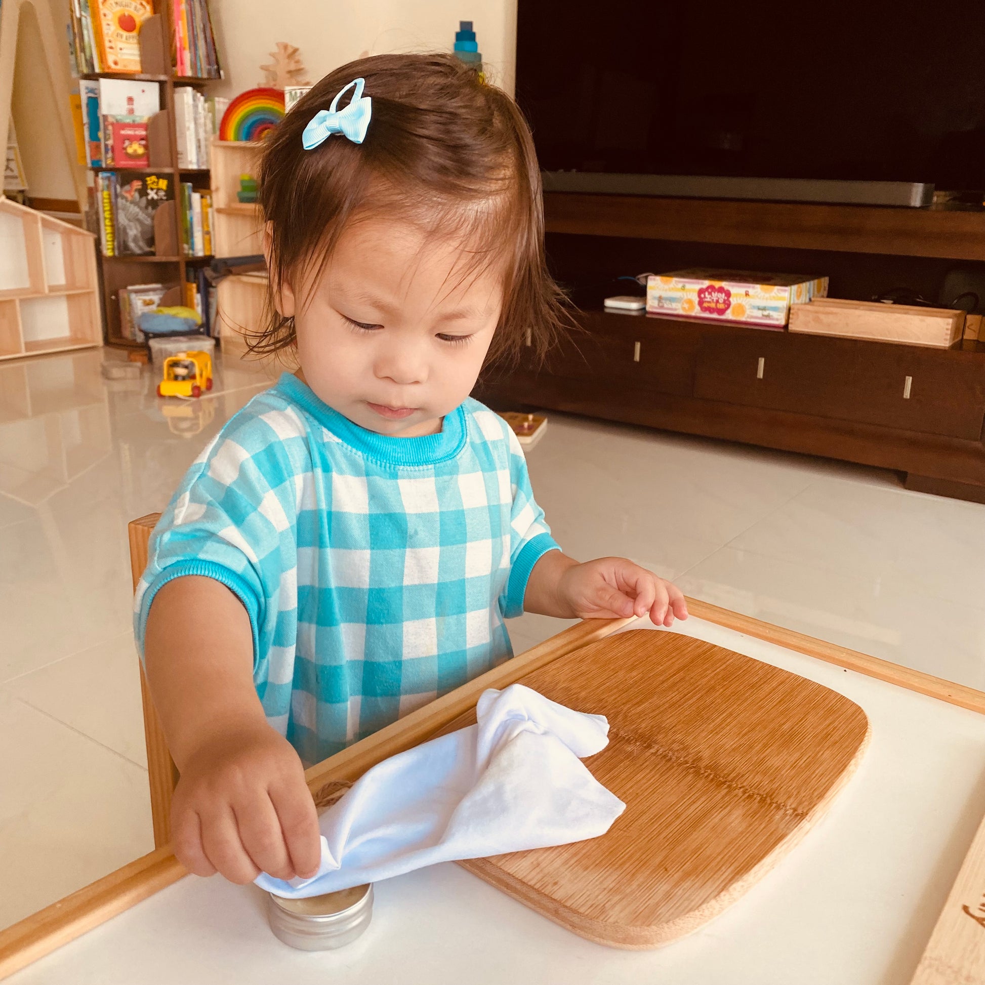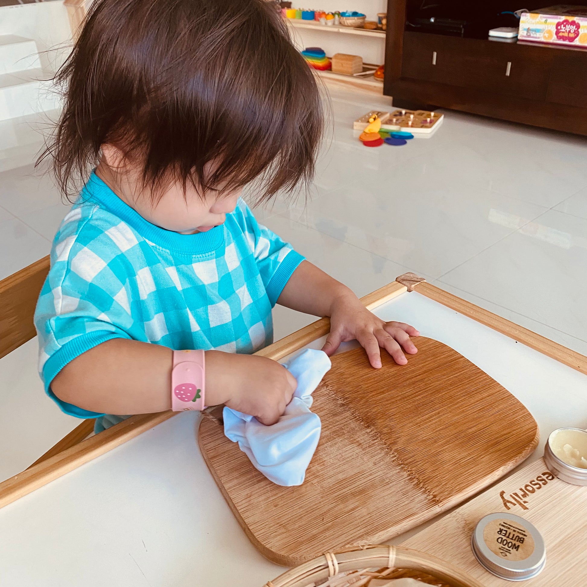 為孩子提供護理砧板與木食器的工具,在日常生活中學習照顧環境與自己的工具。護理組可用在木製砧板,食器如叉湯匙木勺等,木製桌椅或實木色玩具等。
